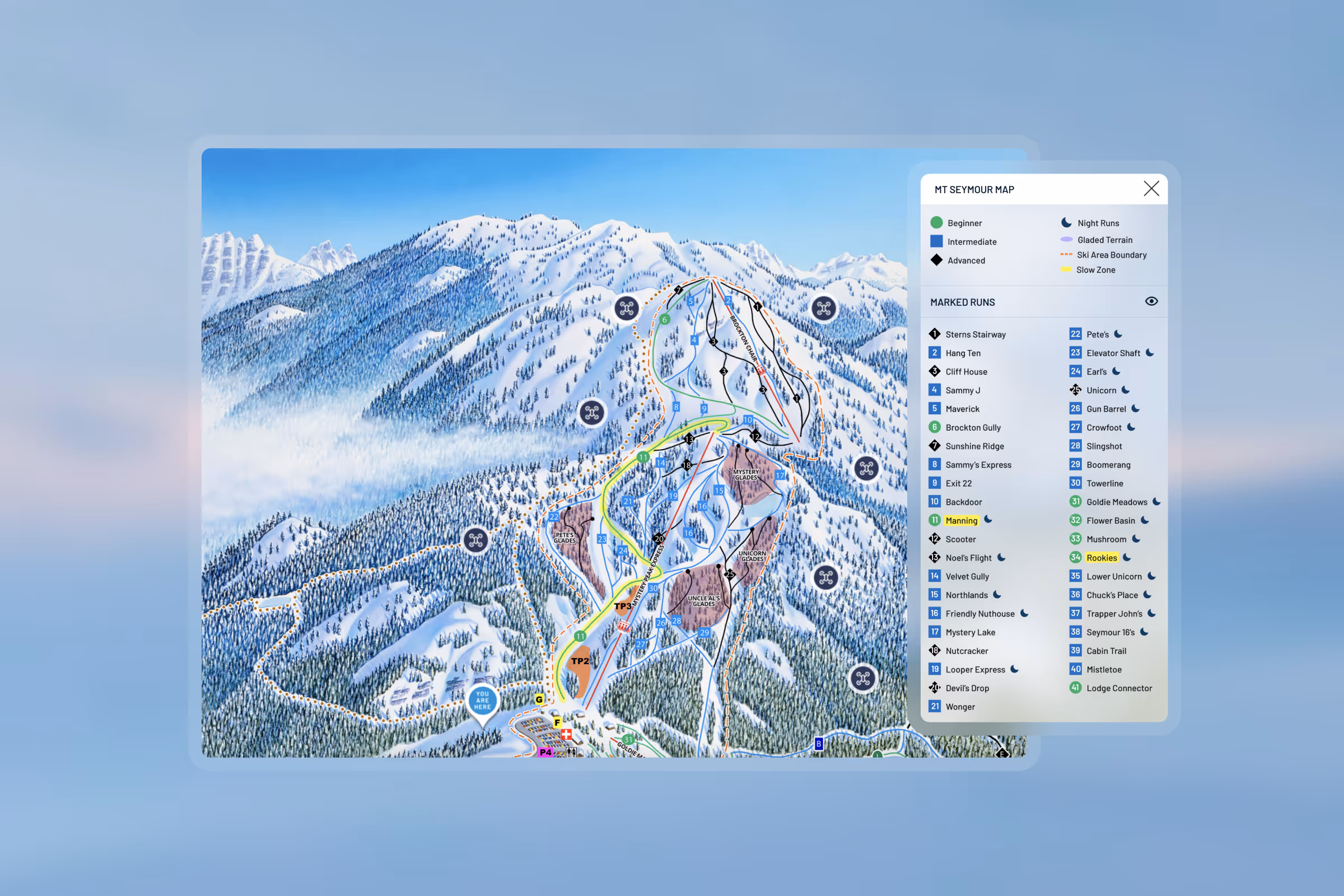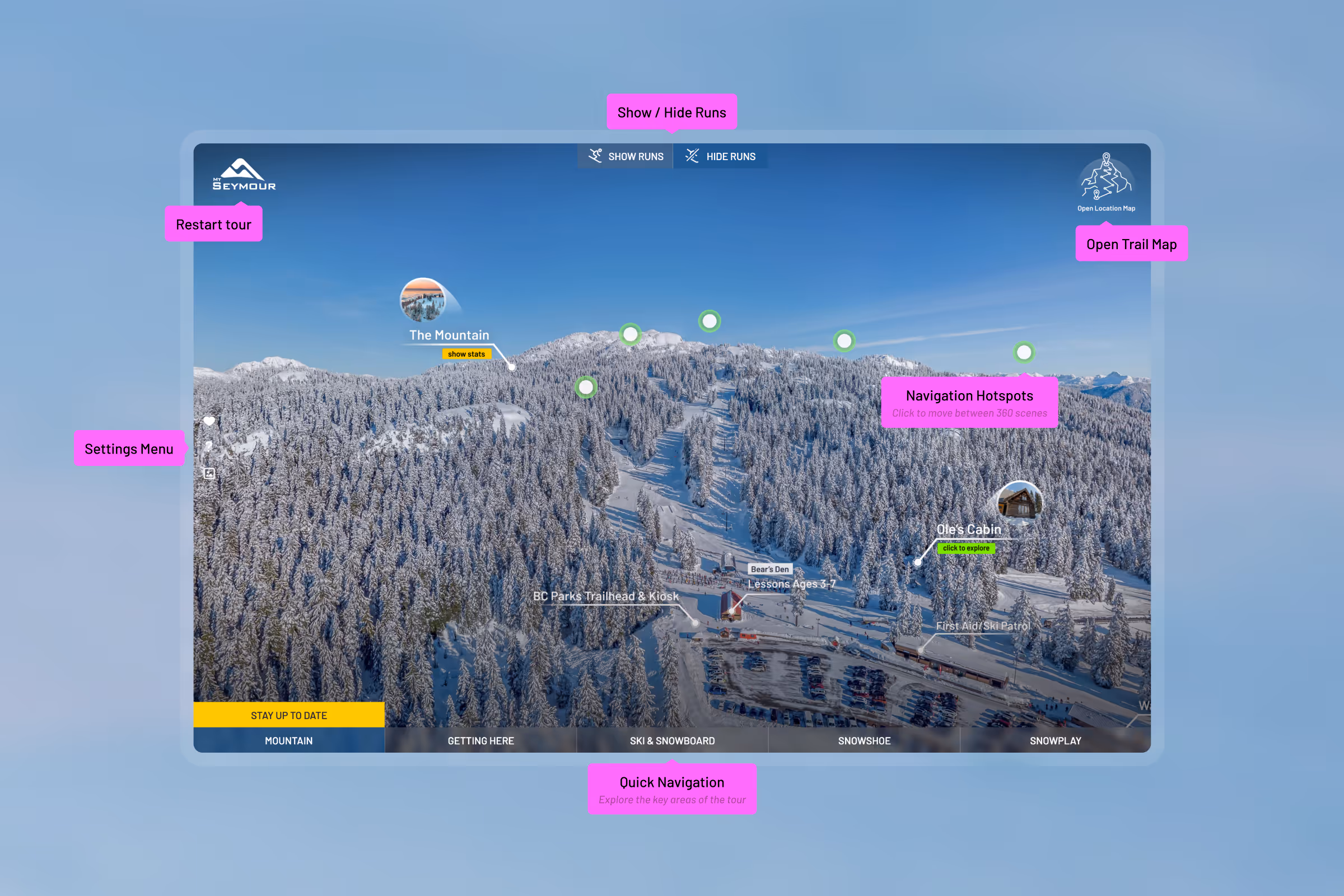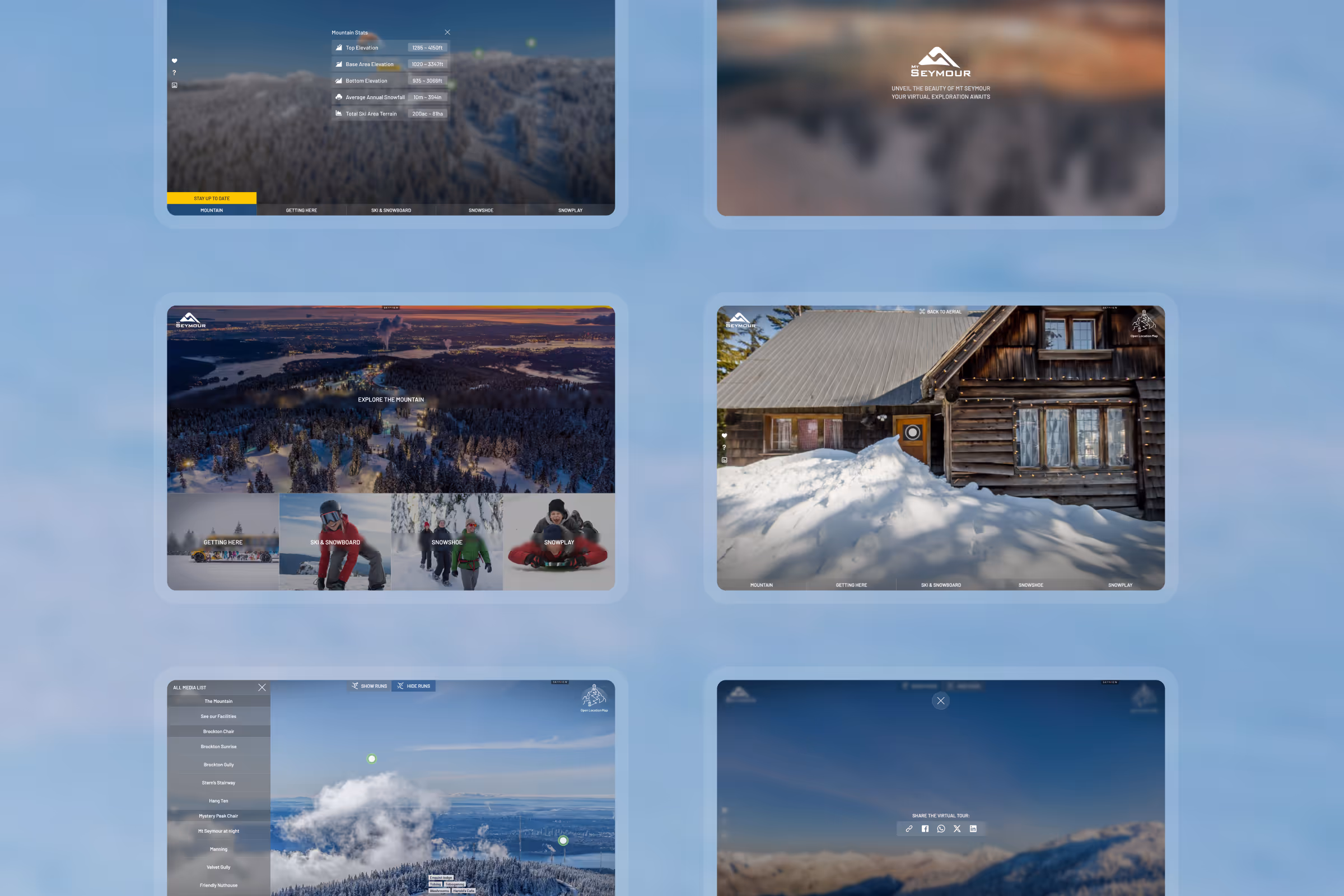 To assist Mt. Seymour in enhancing its digital presence and providing visitors with an immersive preview of the mountain's offerings, I led the design and development of an interactive 360° virtual tour. The objective was to create an engaging experience that showcases the resort's diverse attractions across all seasons, including ski lifts, terrain parks, snowshoe trails, and panoramic viewpoints. By utilizing high-resolution 360° photography and intuitive navigation, the tour offers users a realistic on-site experience accessible across various devices. This project aimed to demystify the mountain's layout for newcomers while highlighting its unique features for seasoned visitors.